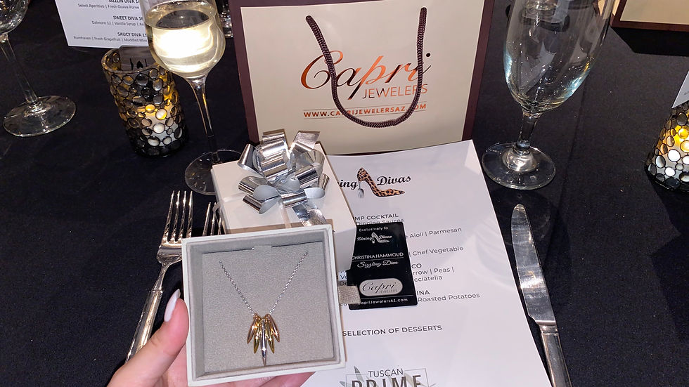 Upon arrival we were greeted at the door with champagne. The set up of the dining table was very elegant and beautiful. Each TV host and influencer was given a personalized gift and name placement. The gift was a necklace, hand picked and provided by Capri Jewelers in Arizona! What a great and thoughtful surprise.